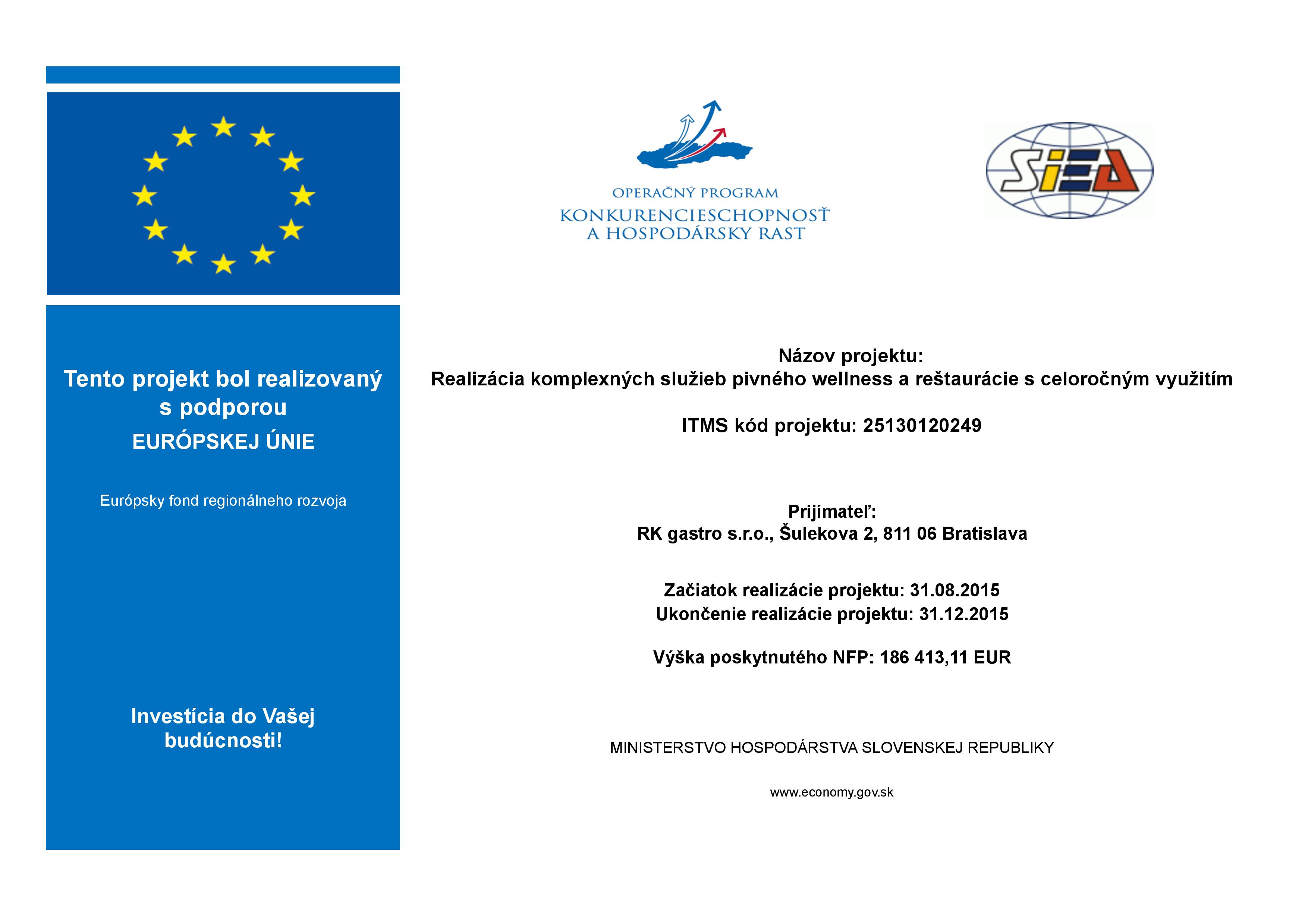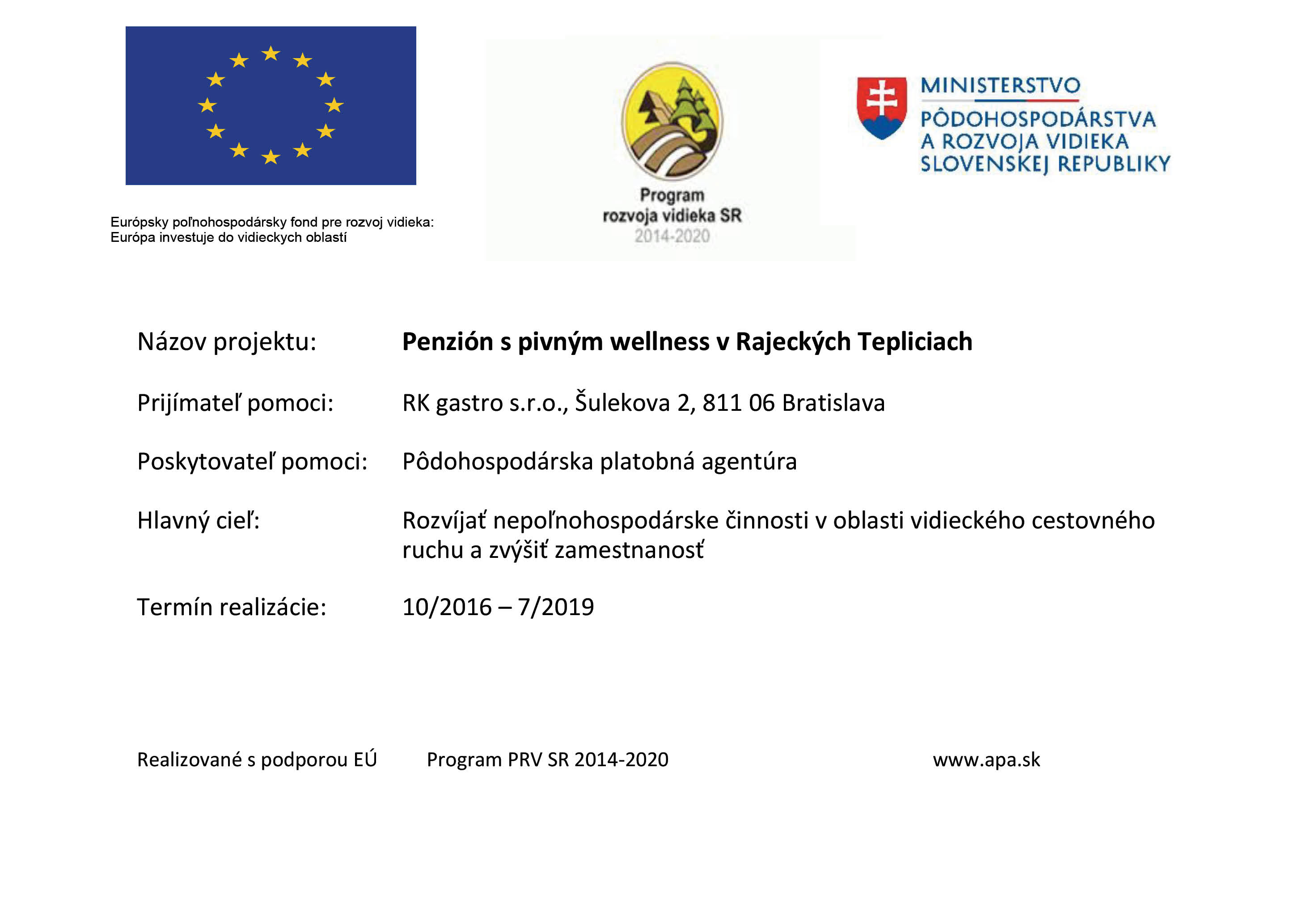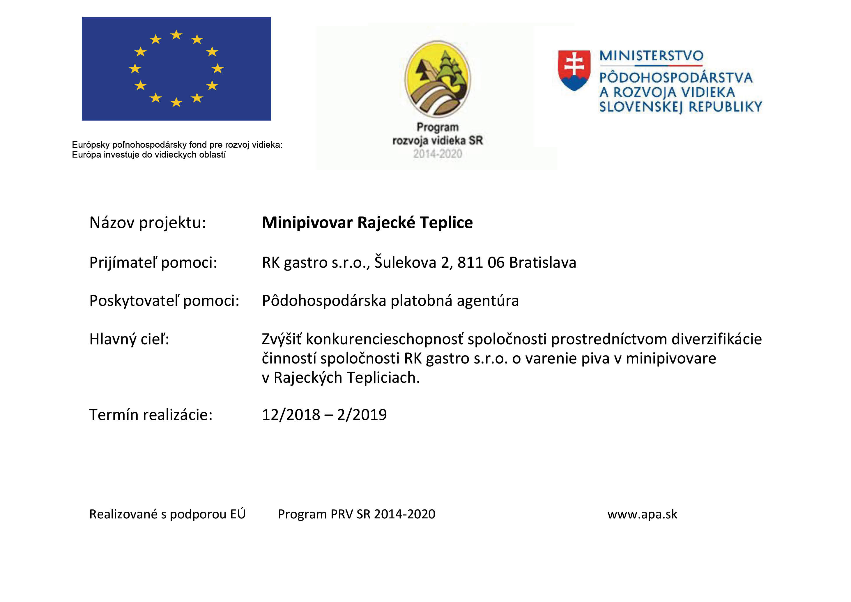 Cieľom projektu realizovaného od decembra 2018 do februára 2019 bolo zvýšiť konkurencieschopnosť spoločnosti RK gastro s.r.o. deiverzifikáciou činností spoločnosti o varenie piva v minipivovare v Rajeckých Tepliciach.